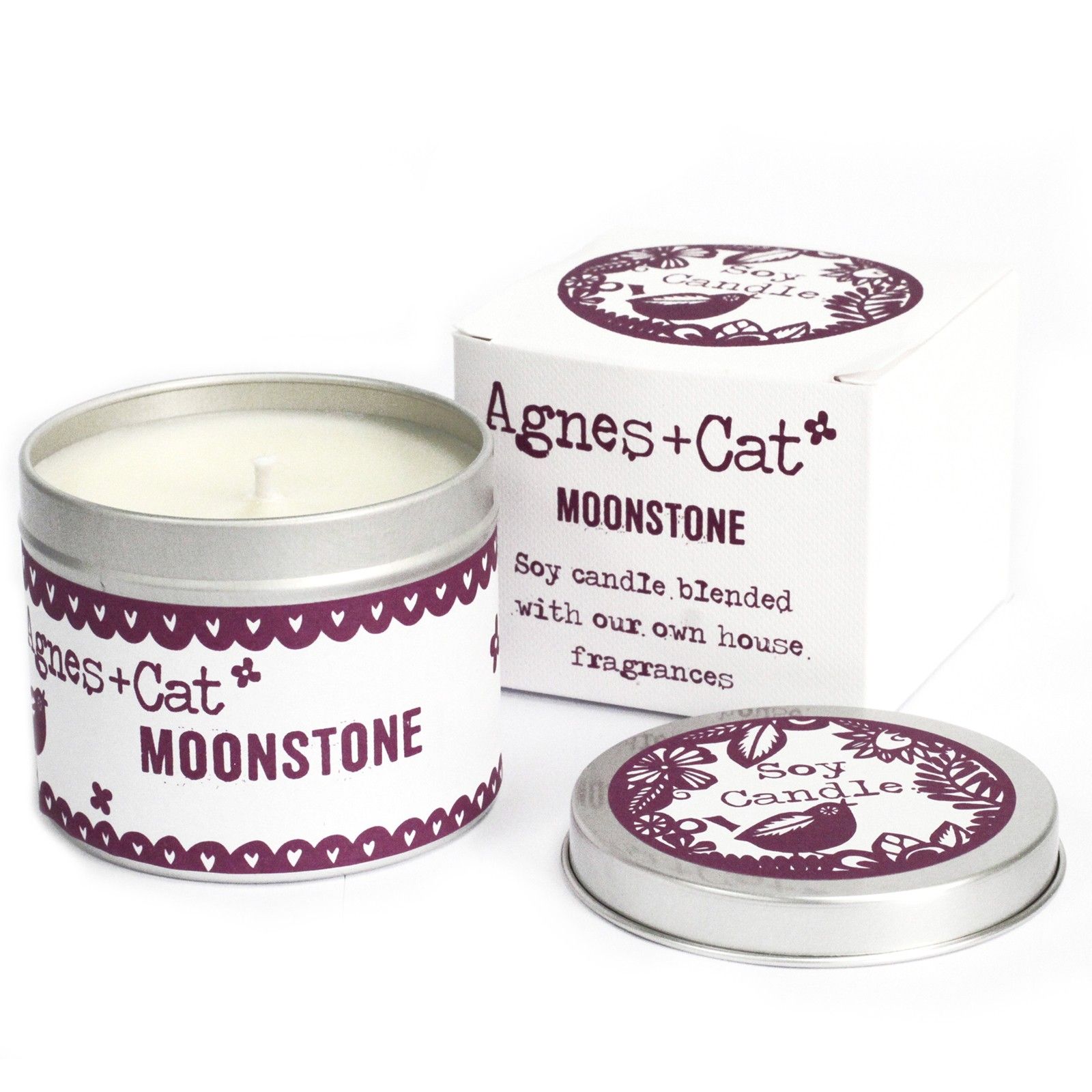 These 200 ml Tin Candles – Moonstone are presented in fancy tins that can be reused once your candle has burned out. They come in pretty box designed in Agnes & Cat iconic style.