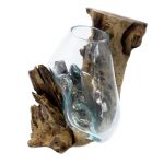 The glass is hand-blown and while still hot it is then relaxed over a piece of Gamal root, the glass then hardens to the shape of the wood ensuring a perfect fit. They are crafted using a natural product by using hand tools in the traditional Balinese way. It provides a one-of-a-kind setting for stones and air plants, cut flowers or a wine decanter.