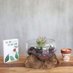 The glass is hand-blown and while still hot it is then relaxed over a piece of Gamal root, the glass then hardens to the shape of the wood ensuring a perfect fit. They are crafted using a natural product by using hand tools in the traditional Balinese way. It provides a one-of-a-kind setting for stones and air plants, cut flowers or a wine decanter.
