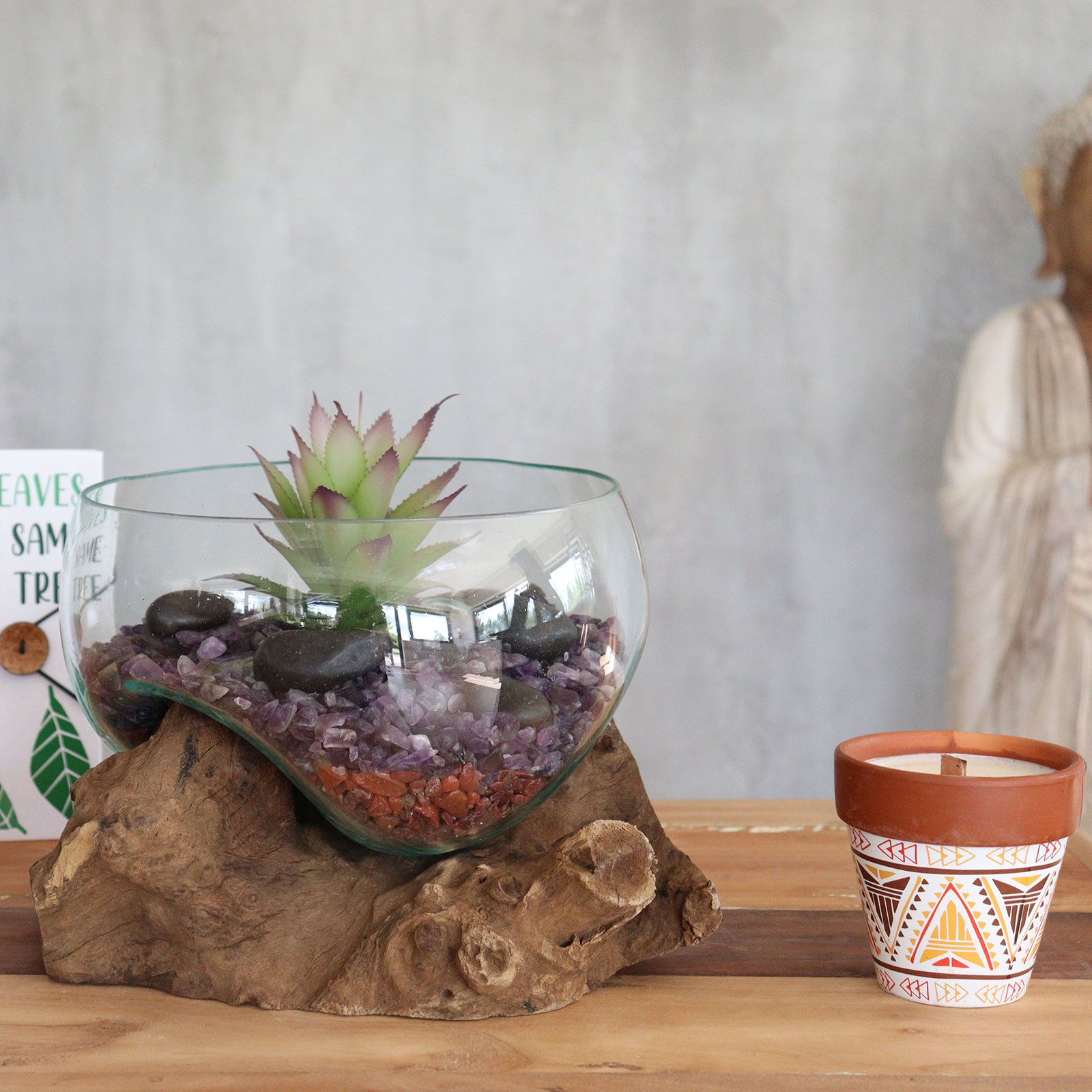 Our handmade melted glass on Wood is probably the biggest thing out of Bali in years, in Holland already a massive trend. Everything house plant related and natural is a major trend, and this beautiful and natural product is right on the button. They are crafted by hand in Bali from recycled glass and Balinese Gamal wood for This stunning, molten art glass vase brings the best of two worlds together: natural and man-made; earthy and chic; practical and spiritual.