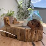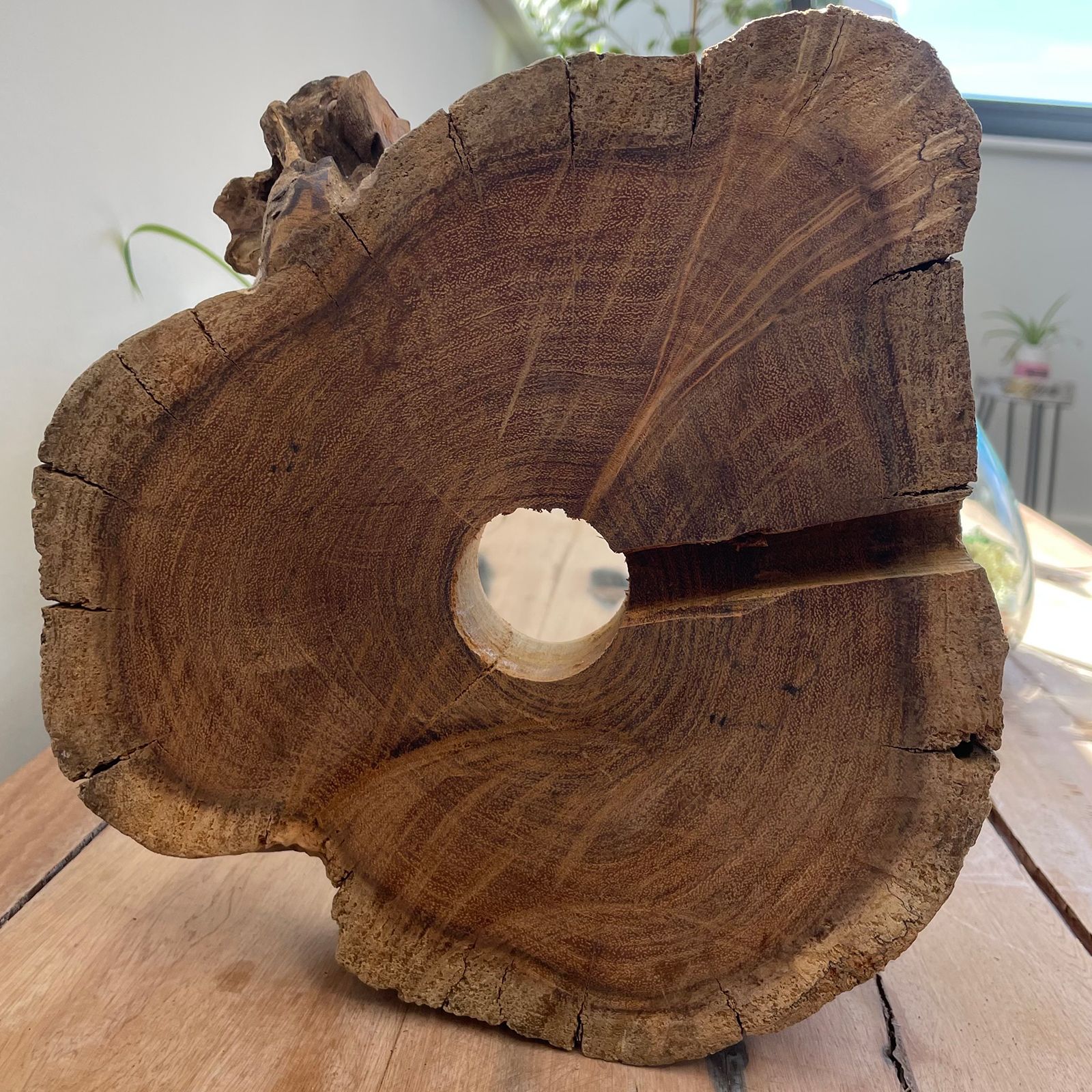 The glass is hand-blown and while still hot it is then relaxed over a piece of Gamal root, the glass then hardens to the shape of the wood ensuring a perfect fit. They are crafted using a natural product by using hand tools in the traditional Balinese way. It provides a one-of-a-kind setting for stones and air plants. Each item is unique as they are made from natural sustainable Gamal wood and the recycled glass is shaped to suit which add to its authenticity, your customer will love it. They can be used for house plants, zen gardens or floating candles. The wooden base has a cavity for the cable and bulb fitting.