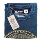 This small-sized Chakra t-shirt in stone washed blue is crafted from 100% premium cotton, double stone washed twice for a luxuriously soft, durable fabric with a vintage look. Pre-shrunk to maintain its fit wash after wash, it features a tag-free printed neck label for irritation-free comfort. Handmade by experienced artisans in Nepal under fair trade standards, this tee supports ethical fashion. The vibrant Chakra design on the faded blue fabric makes it a stylish and unisex choice for daily wear or travel.