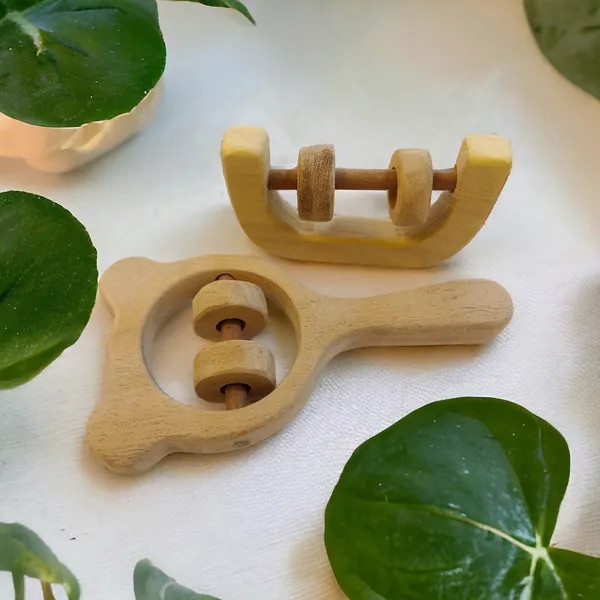 Soothing Sound Making Set of 2 Neem Wooden Rattles – Mickey Head & C Shape