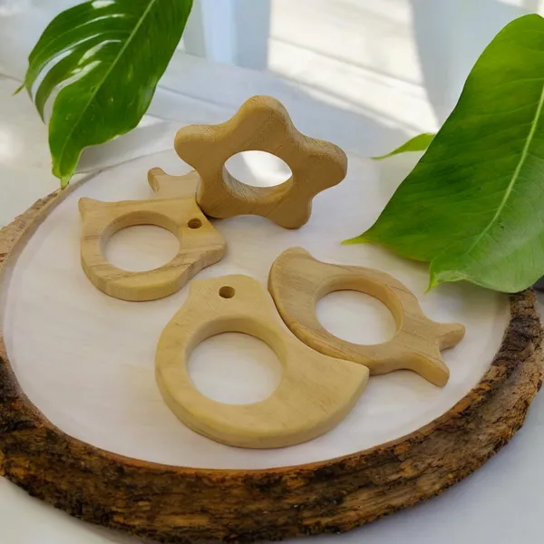 Pack of 4 Neem Wooden Teethers- Rabbit, Flower, Dove & Mango Shapes